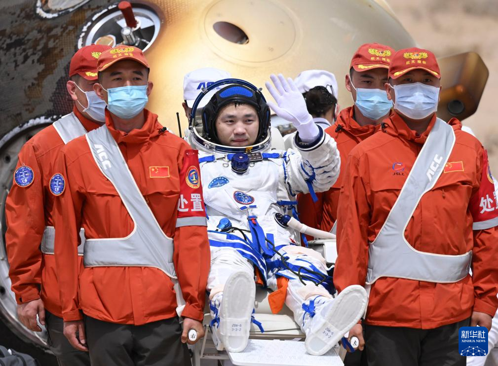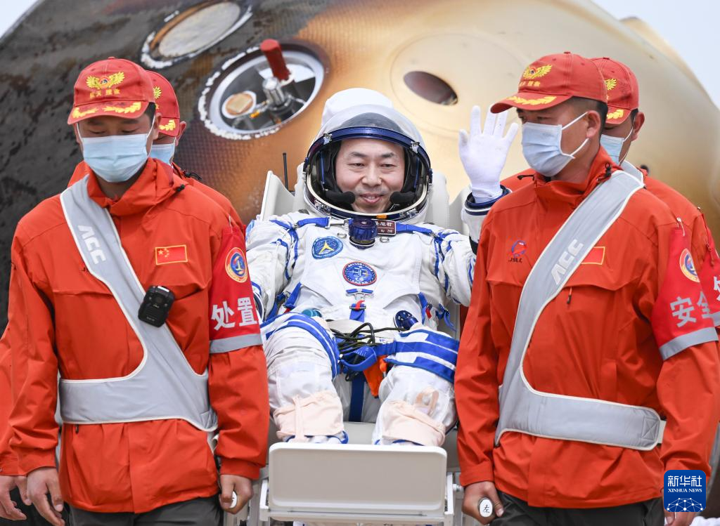4月30日,神舟十九号航天员宋令东安全顺利出舱后,与工作人员相互致意。