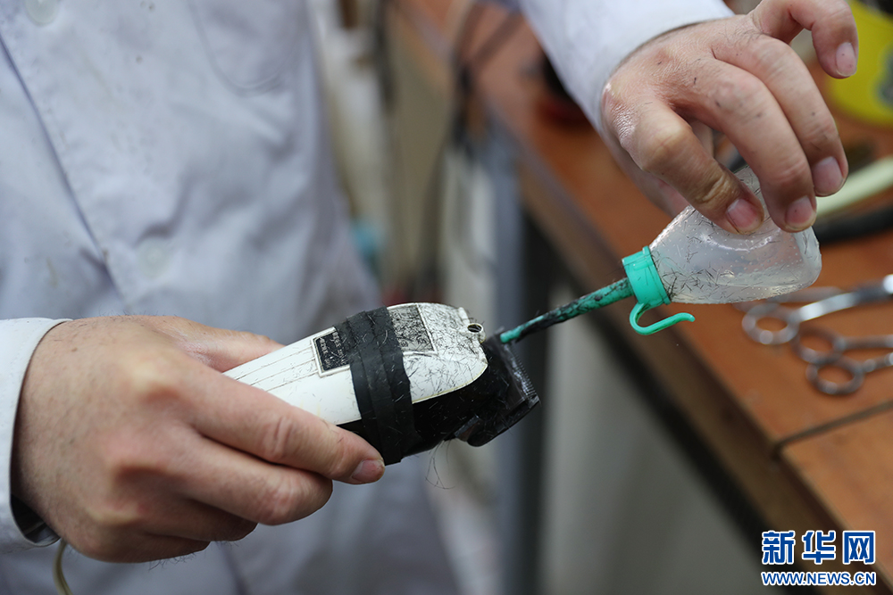 王建在给电推子上润滑油。新华网记者 焦鹏 摄