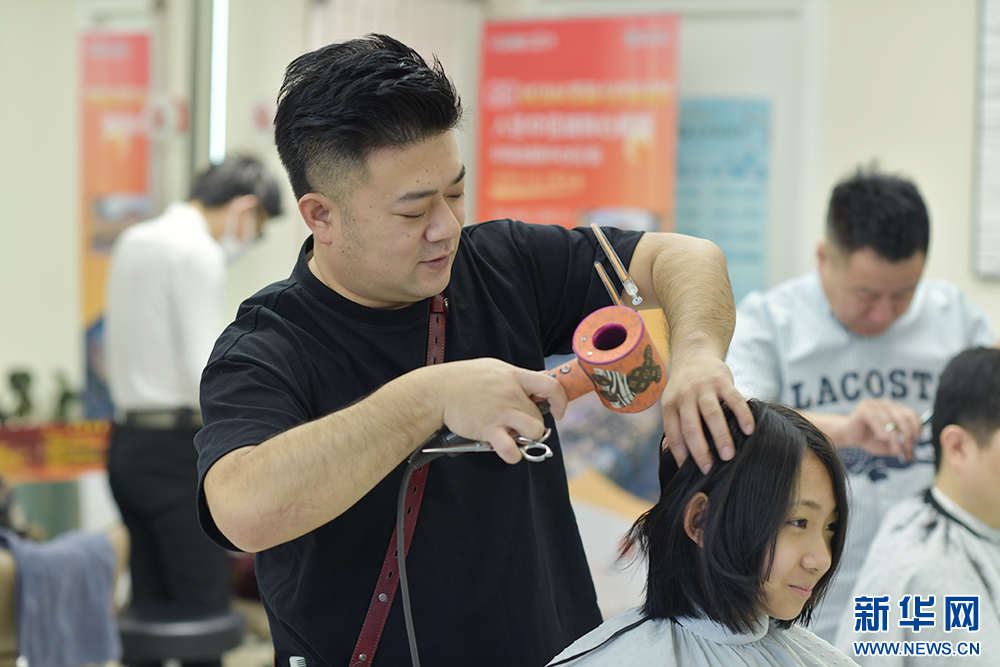 4月4日,茉丽卡护肤造型总经理卢伟在为顾客理发。新华网记者 焦鹏 摄