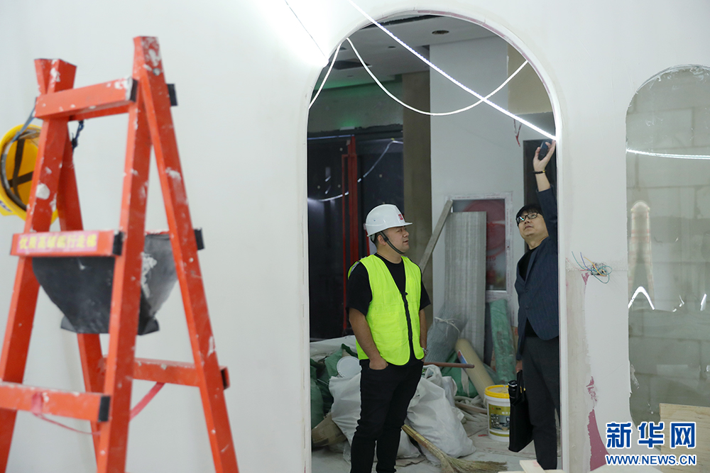 4月4日,茉丽卡护肤造型总经理卢伟和设计师一同查看正在装修的新店面,商议装修方案。新华网记者 焦鹏 摄