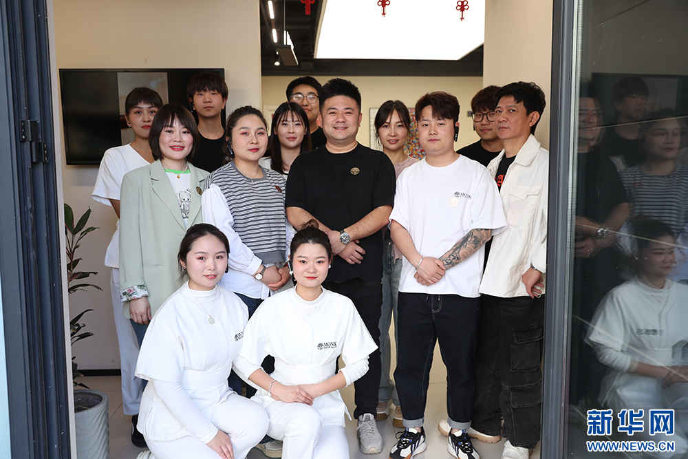 4月4日,茉丽卡护肤造型总经理卢伟和店员在门店前合影。新华网记者 焦鹏 摄