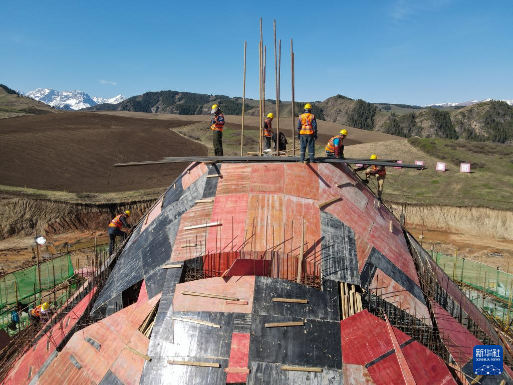 4月30日,工人在奇台射电望远镜中心塔施工现场作业。