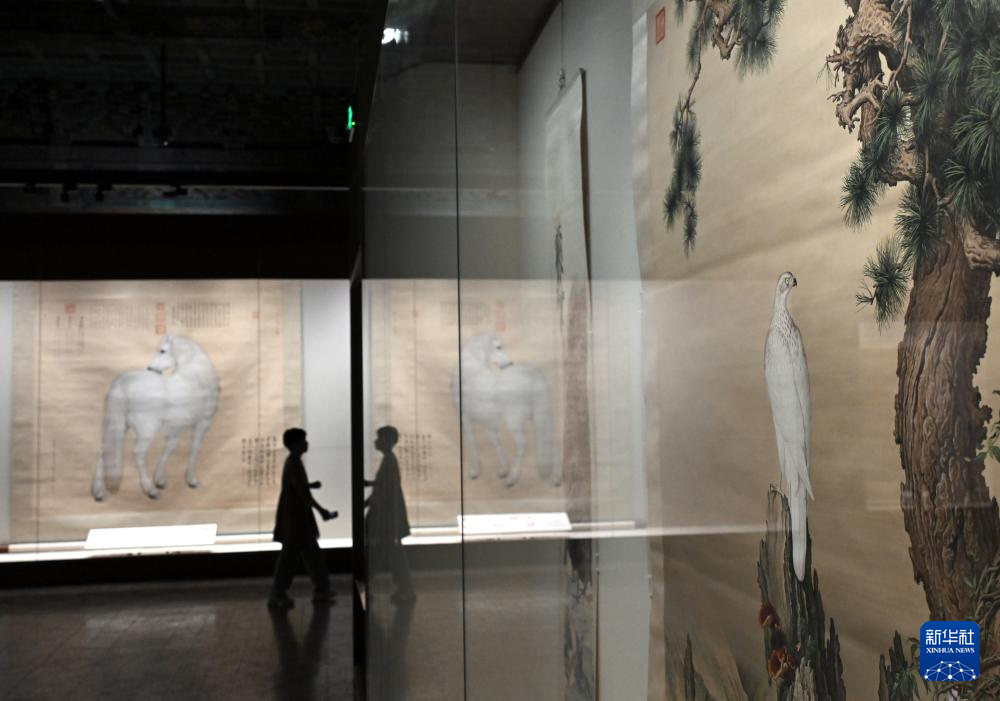 在文华殿展出的清代郎世宁的《嵩献英芝图》(右)和《十骏图·万吉骦》(左)(4月28日摄)。