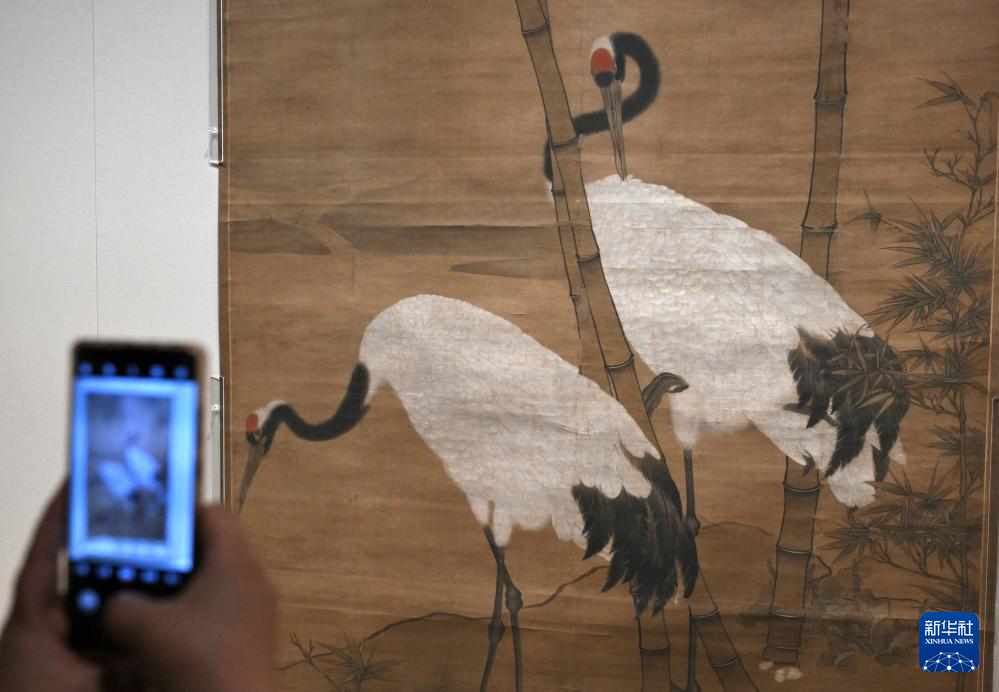 记者在拍摄明代画家边景昭的《竹鹤图》(4月28日摄)。