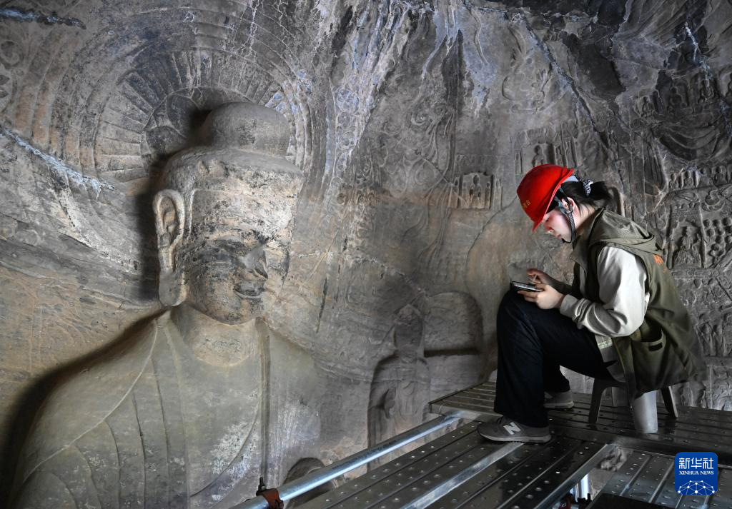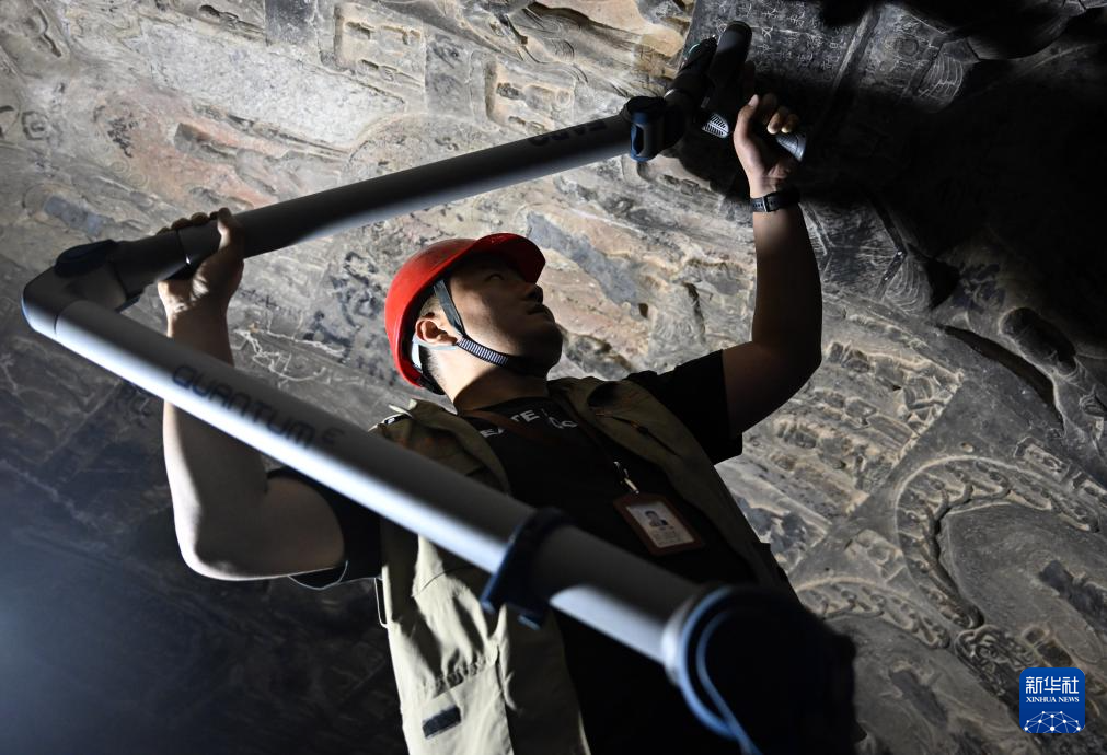 4月9日,龙门石窟研究院工作人员在古阳洞使用关节臂扫描仪对像龛进行数字化扫描。
