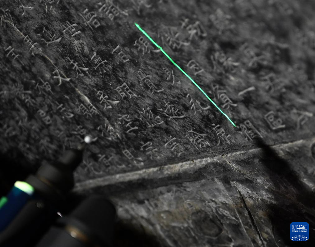 4月9日,龙门石窟研究院工作人员在古阳洞使用关节臂扫描仪对《龙门二十品》之一进行数字化扫描。