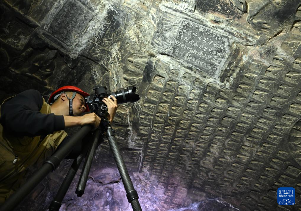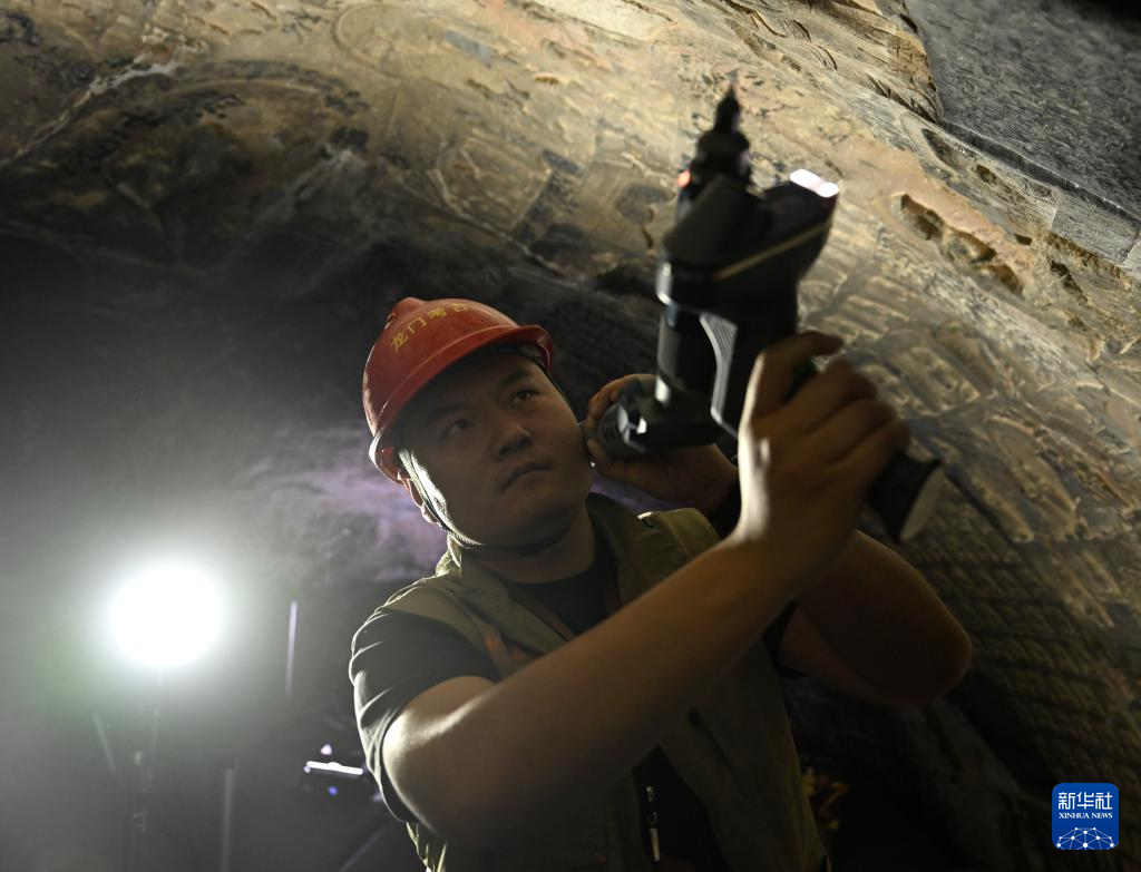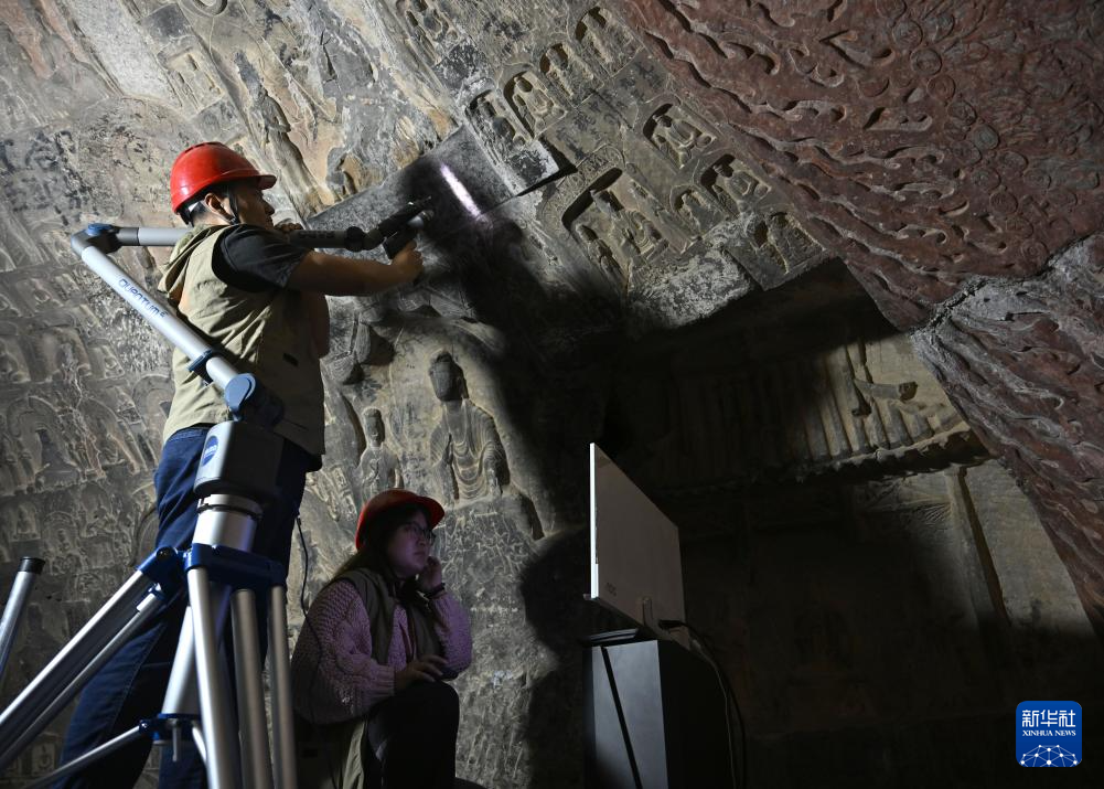 4月10日,武汉大学文化遗产智能计算实验室团队成员(下)与龙门石窟研究院工作人员在魏字洞进行高清摄影扫描。