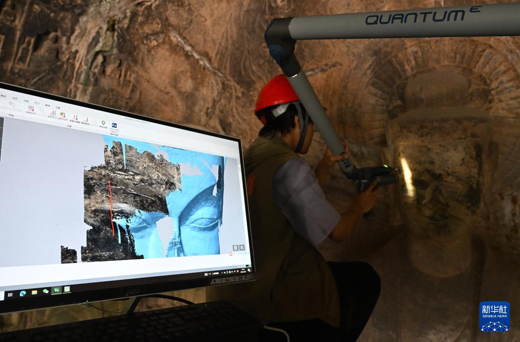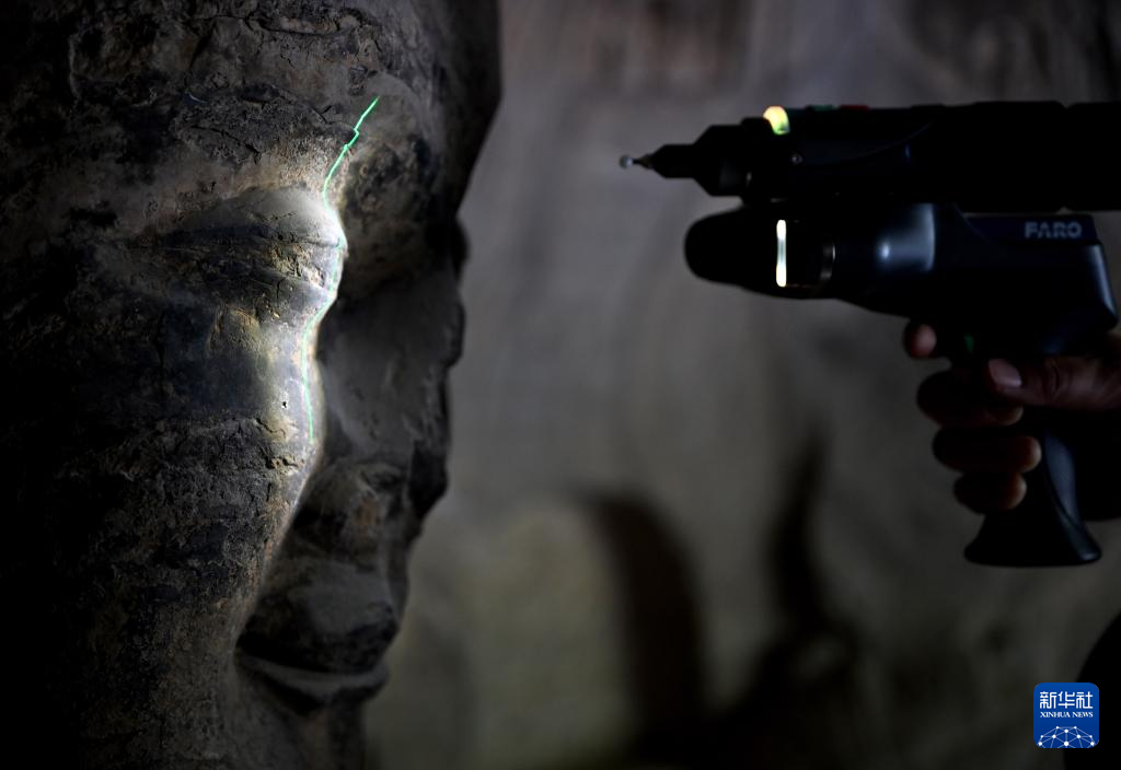 4月9日,龙门石窟研究院工作人员在魏字洞使用关节臂扫描仪对佛像进行数字化扫描。