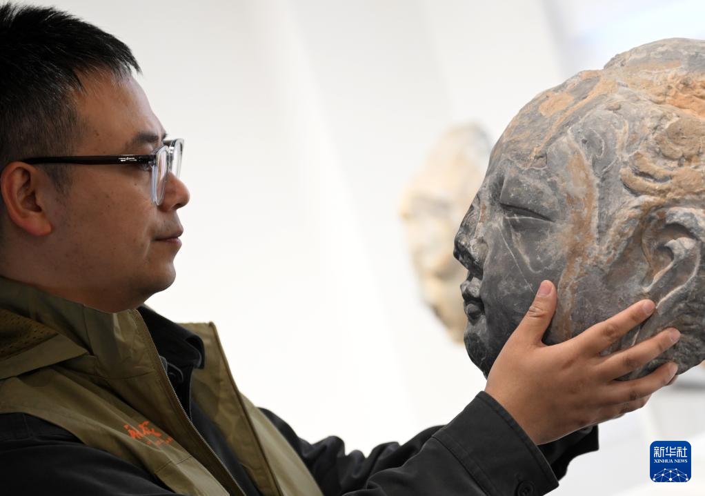 4月10日,龙门石窟研究院工作人员在查看3D打印的佛首模型。