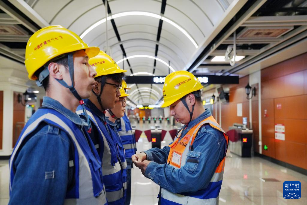 在哈尔滨地铁2号线南直路站,班组安全员何孬(右)在核对地铁供电维保检修工人们的安全操作卡(4月29日摄)。