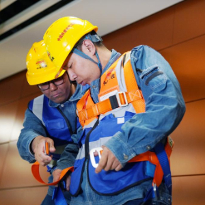 在哈尔滨地铁2号线南直路站,班组安全员何孬(右)穿戴安全装备(4月29日摄)。