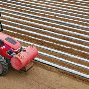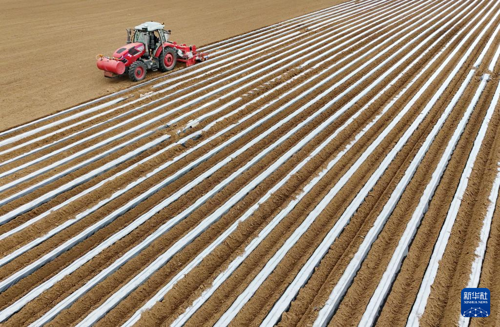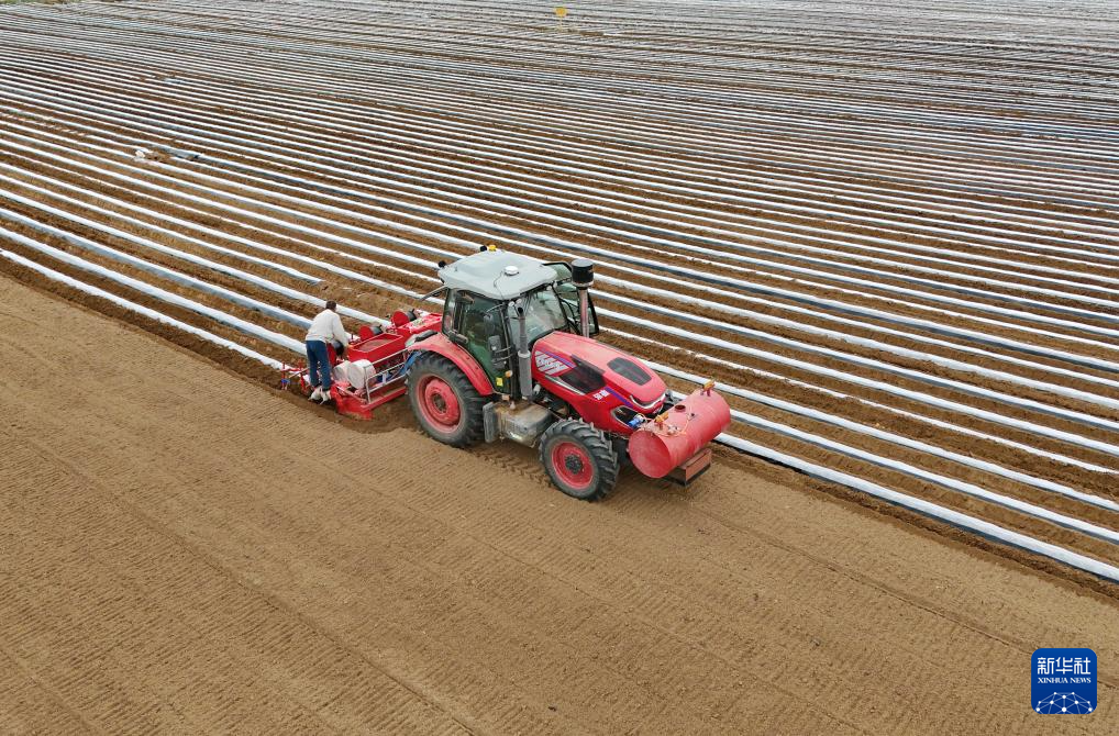5月2日,卢龙县卢龙镇一家甘薯种植合作社的社员在田间使用农机开沟覆膜,准备栽种甘薯秧苗(无人机照片)。
