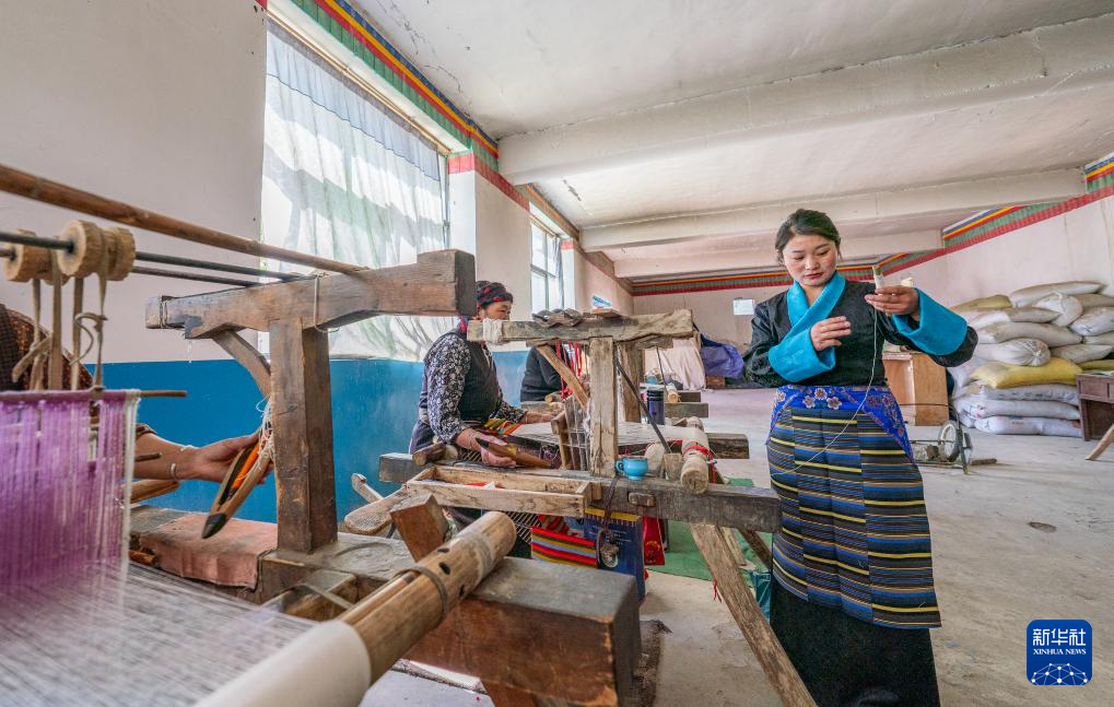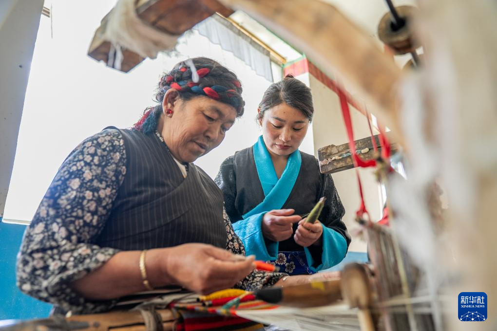 旦增卓嘎(右)和合作社的妇女调整编织机(4月23日摄)。
