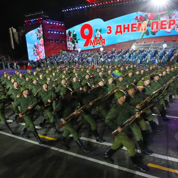 5月2日,在白俄罗斯首都明斯克,士兵列队参加纪念卫国战争胜利80周年阅兵式彩排。