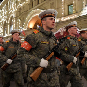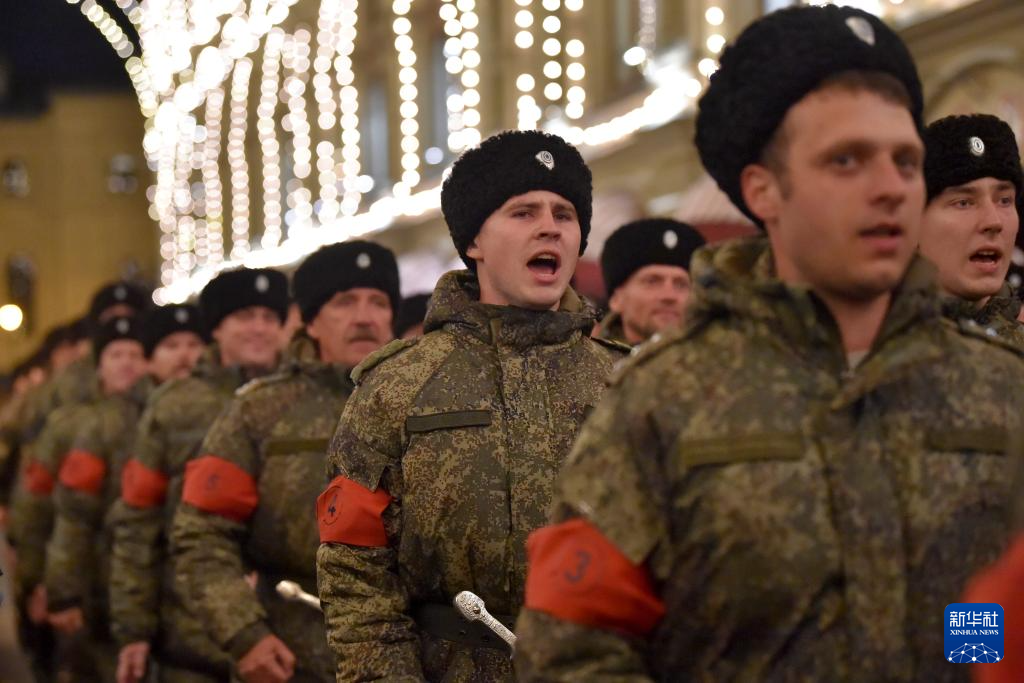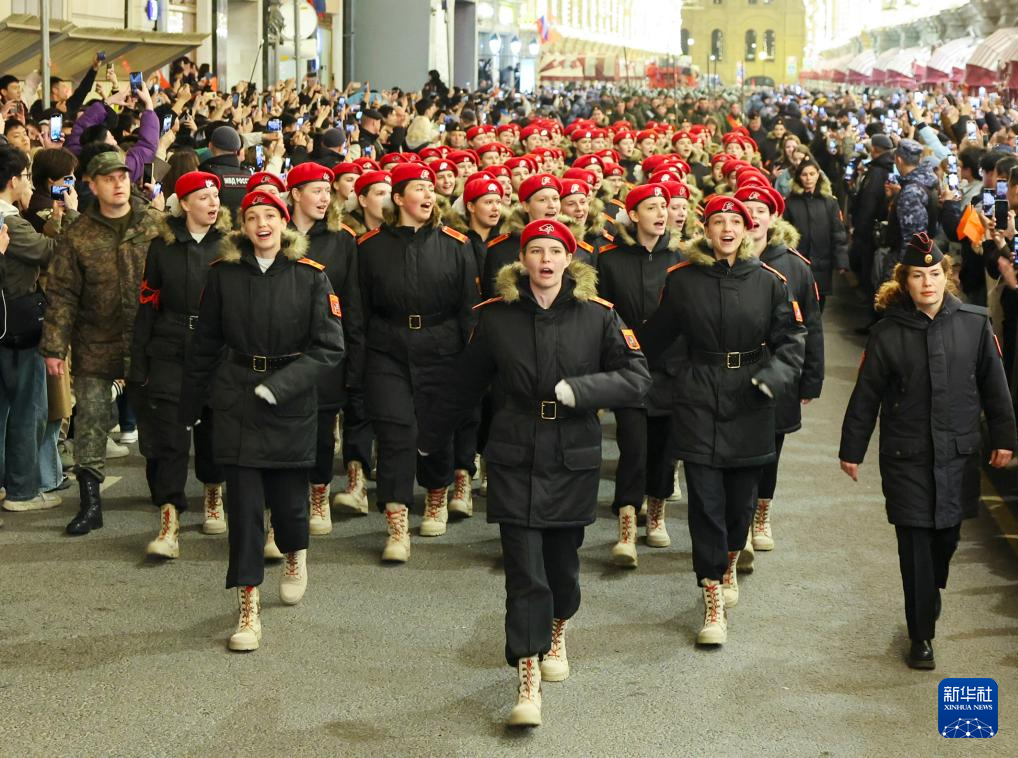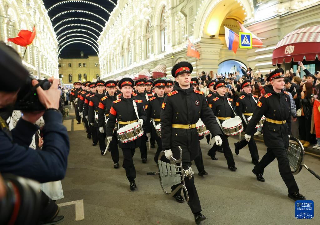 5月3日晚,受阅方队在俄罗斯首都莫斯科前往红场参加彩排。