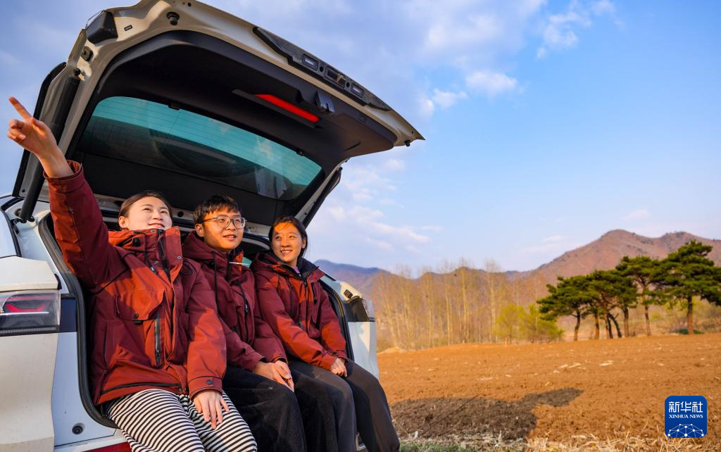 4月28日,耿飞飞(左一)、王佳玉、王储(右一)在北兴村村口合影。