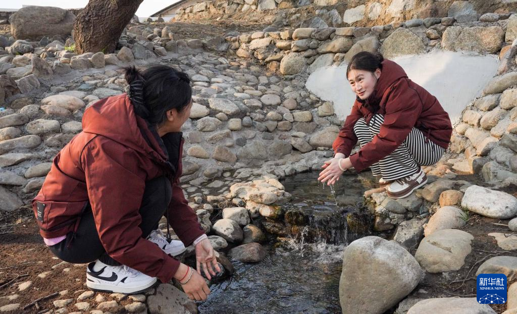 4月29日,耿飞飞(右)与王佳玉在村中的泉水里洗手。