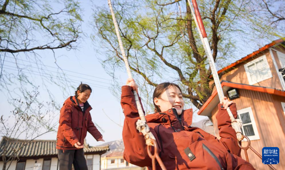 4月28日,王佳玉(左)与耿飞飞在村中的朝鲜族庭院内打秋千。
