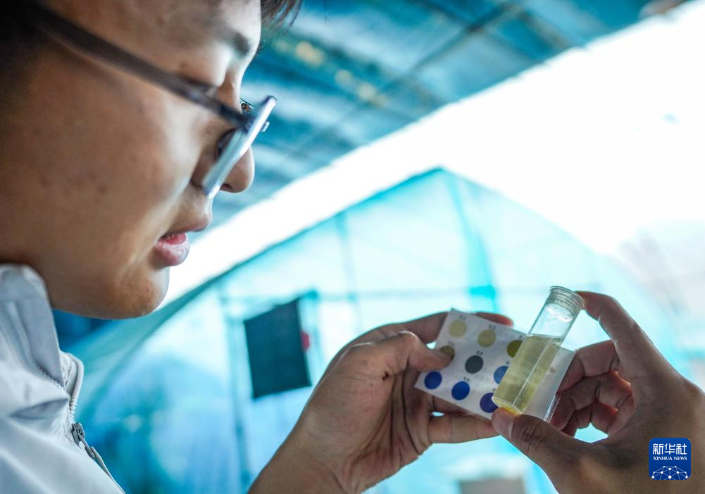 4月29日,王储用试剂盒比对钓虾池的水质状况。