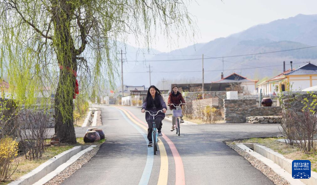 4月29日,王佳玉(左)与耿飞飞在村中骑自行车。