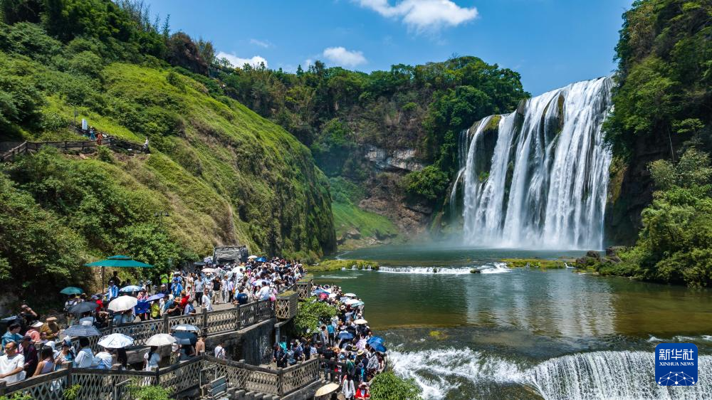 5月4日,游客在贵州省安顺市黄果树瀑布景区游览(无人机照片)。