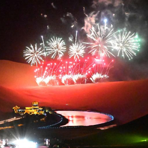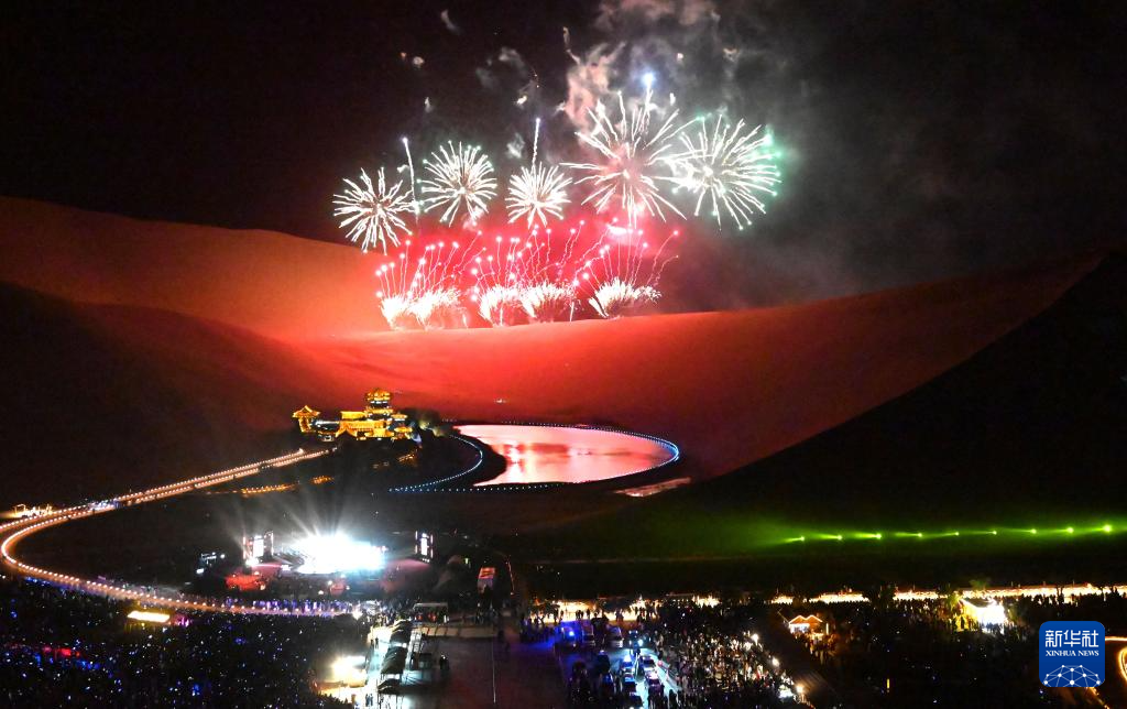 5月4日晚,游客在甘肃省敦煌市鸣沙山月牙泉景区观看烟花。