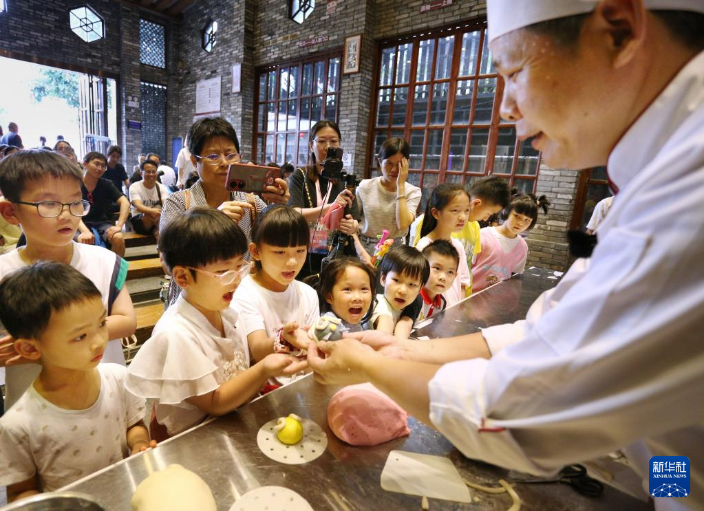 5月2日,在广东省佛山市禅城区南风古灶旅游休闲街区,孩子们在观看粤菜师傅制作特色点心“狮头包”。