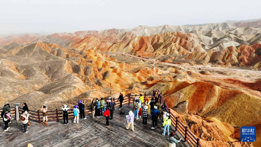 5月4日,游客在位于甘肃省张掖市的七彩丹霞景区游览。
