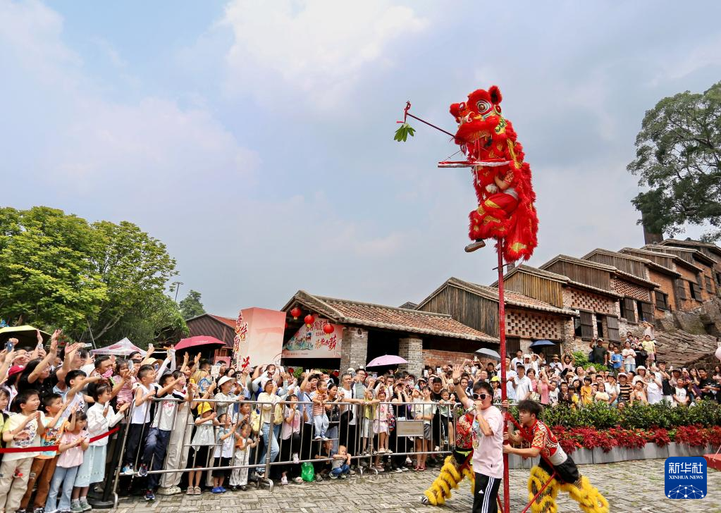 5月5日,在湖南省湘西土家族苗族自治州吉首市,民间艺人为游客表演狮子登高。