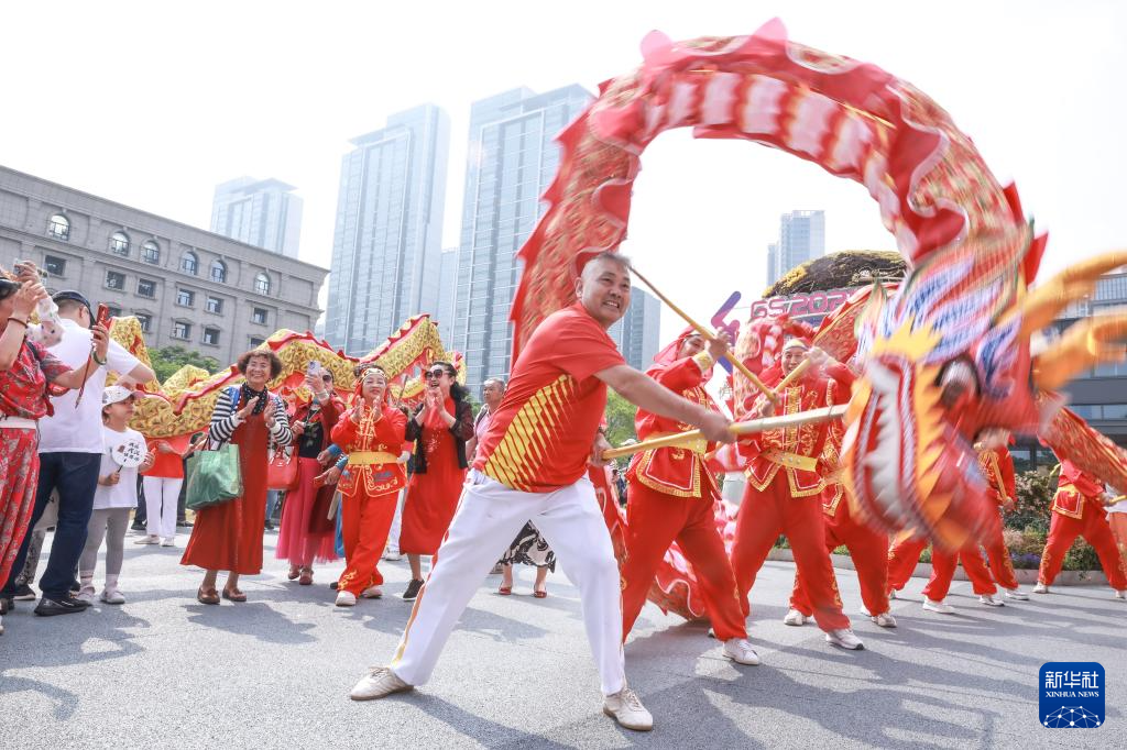 5月5日,在武汉市武昌区沙湖公园举办的世界花园大会现场,民间艺人为游客表演舞龙。