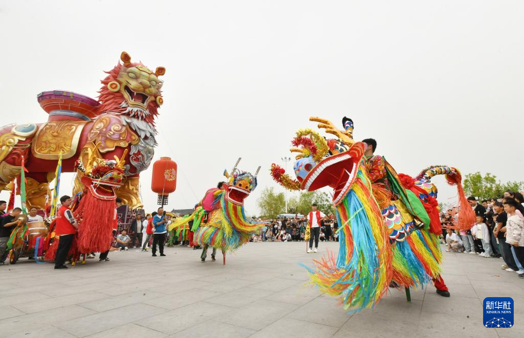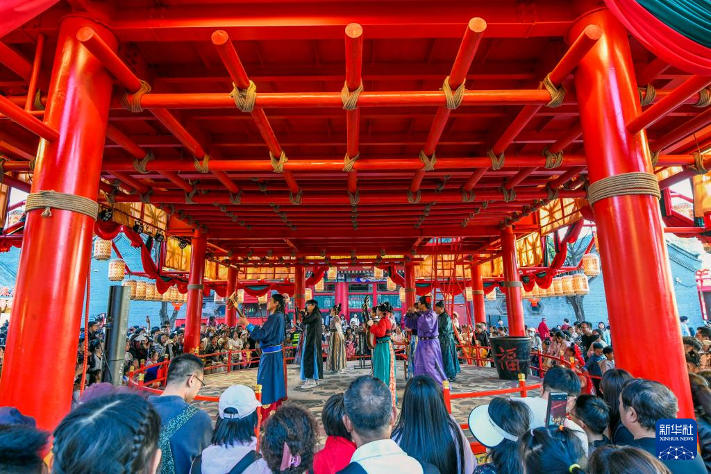 5月3日,游客在河北省唐山市丰南区河头老街景区观看表演。