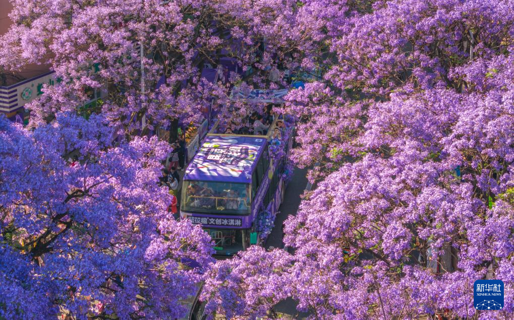5月5日,在云南省昆明市五华区教场中路,游客们乘坐蓝花楹主题观光巴士,欣赏蓝花楹盛开景色(无人机照片)。