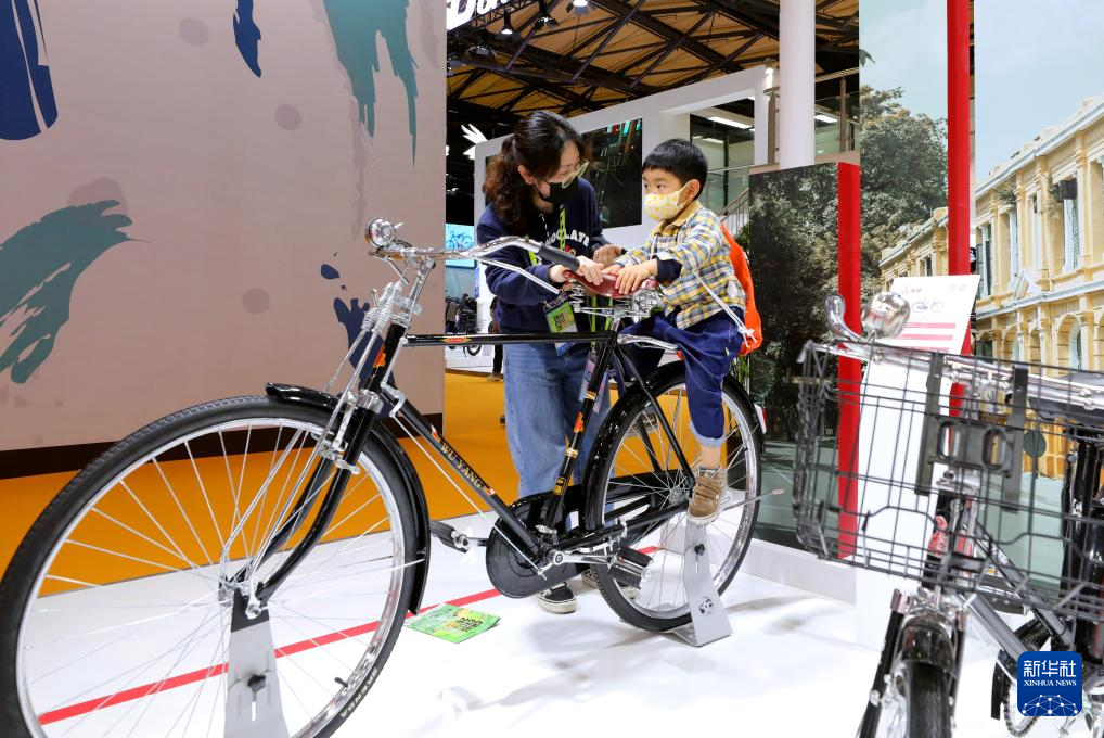 5月5日,在上海新国际博览中心举行的2025中国国际自行车展览会上,一名家长带着小朋友体验一款传统自行车。