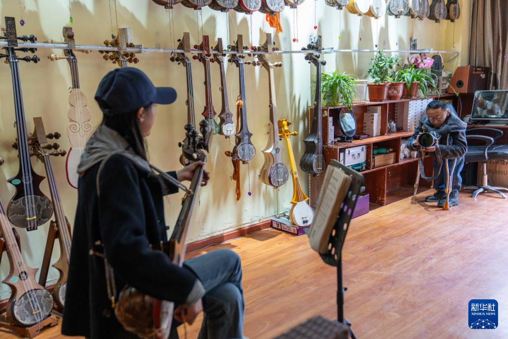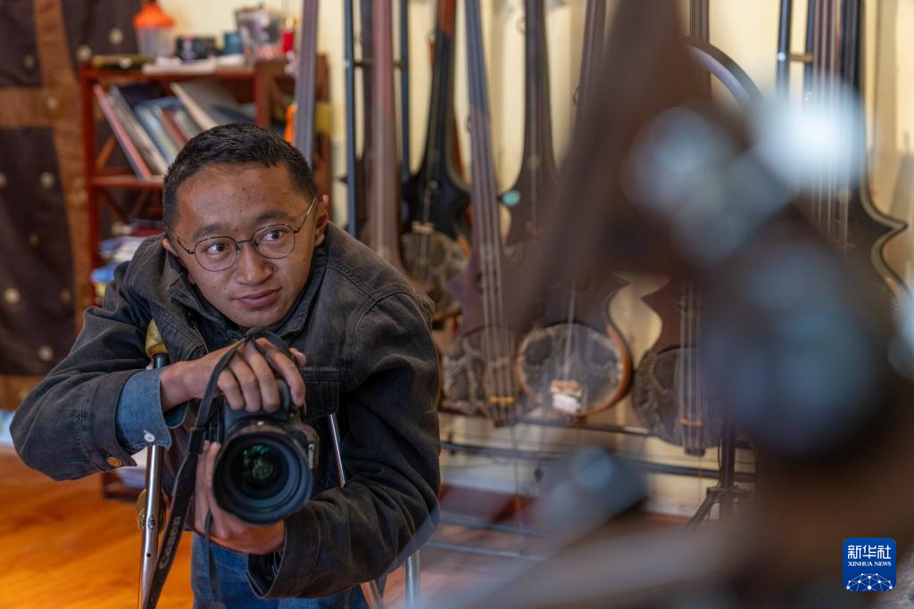 5月6日,拉巴顿珠在公司拍摄同事演奏西藏传统乐器“扎念琴”的照片和视频。