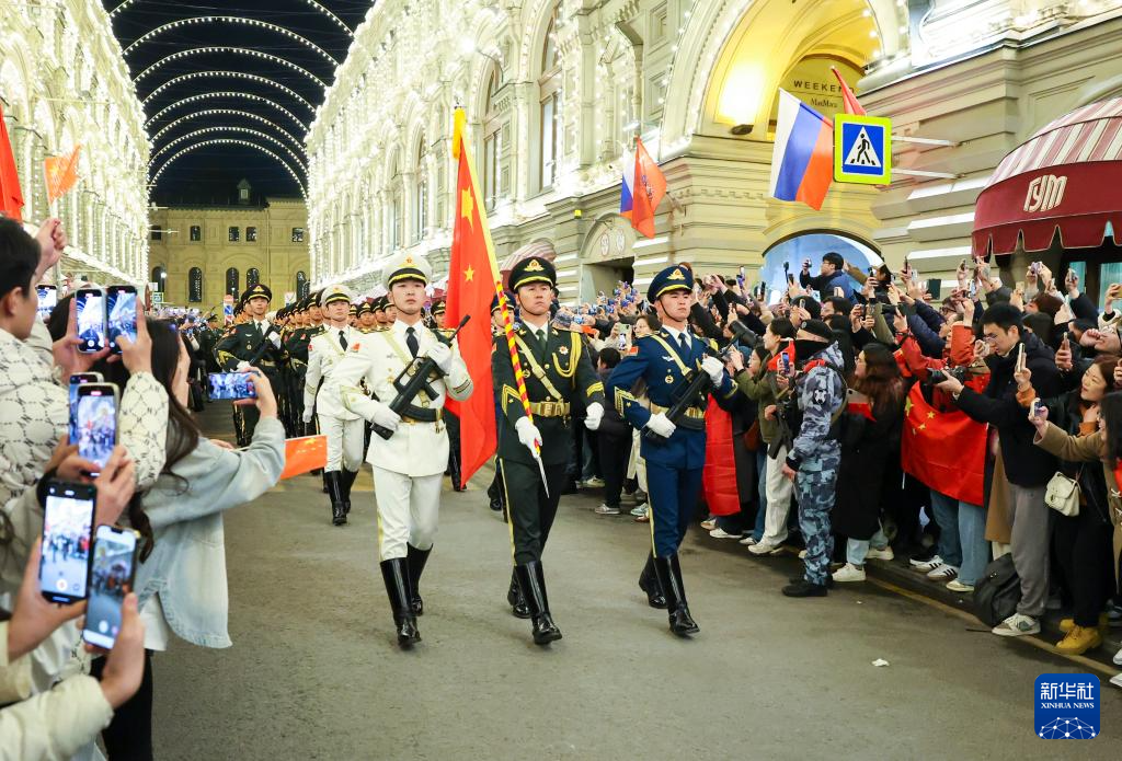 5月3日,在俄罗斯首都莫斯科,中国人民解放军仪仗司礼大队参加苏联伟大卫国战争胜利80周年阅兵式彩排。