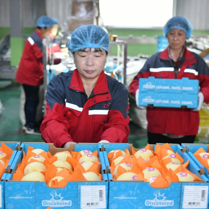 5月7日,河北泊头东方果品有限公司工人在鲜梨分选包装车间工作。