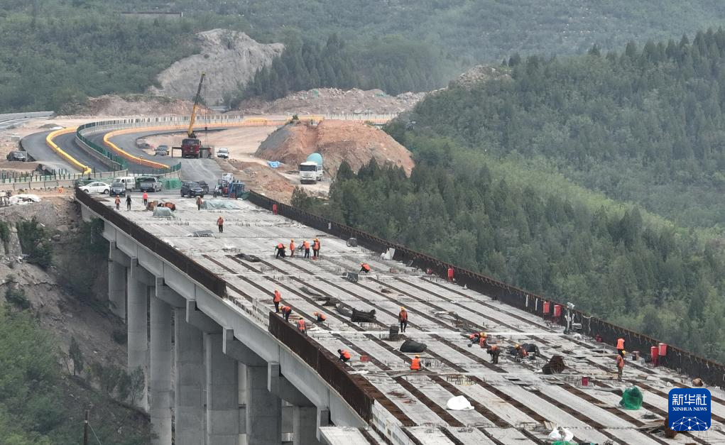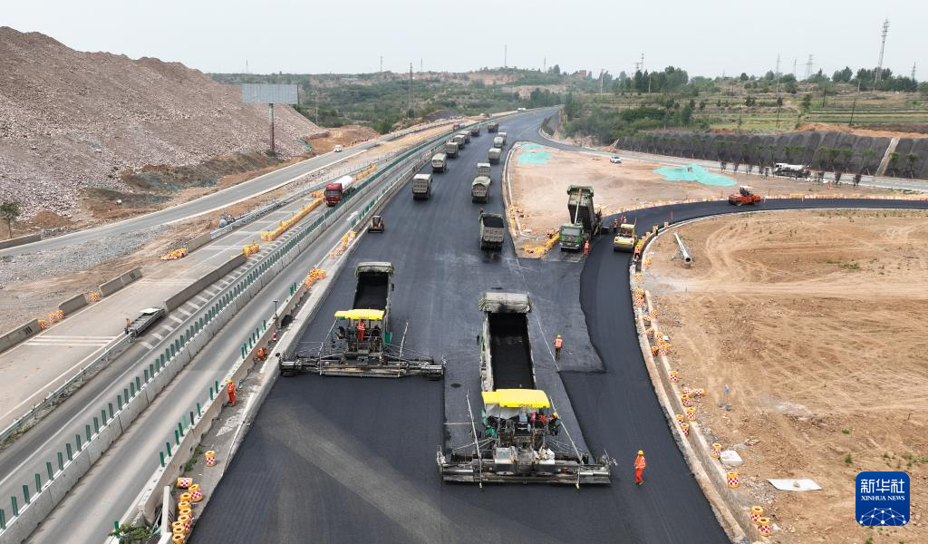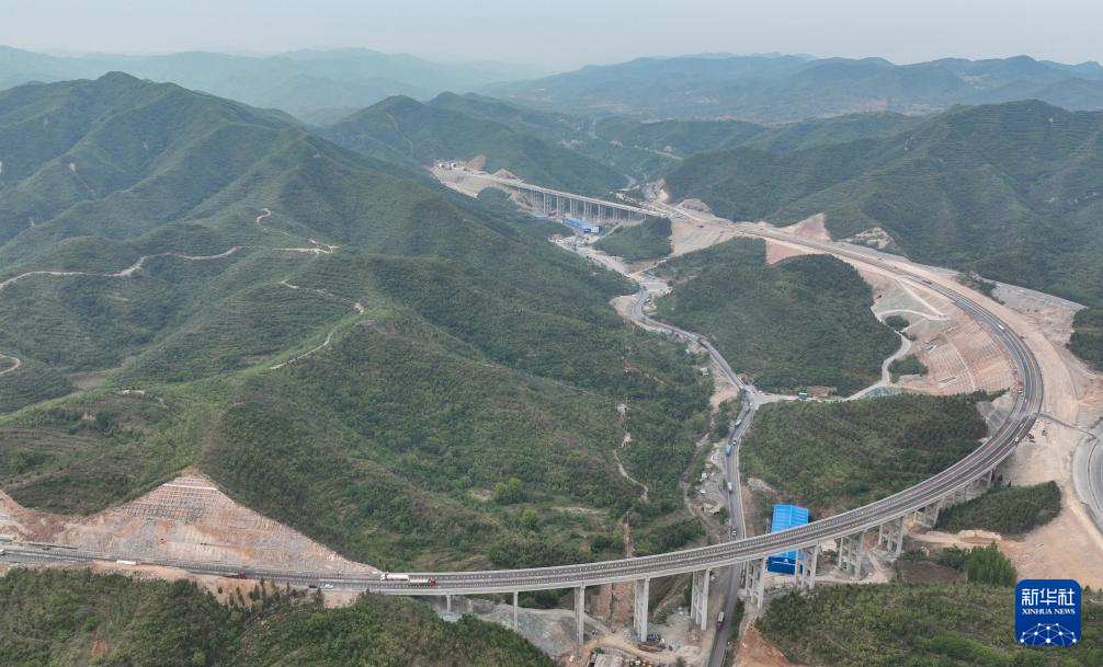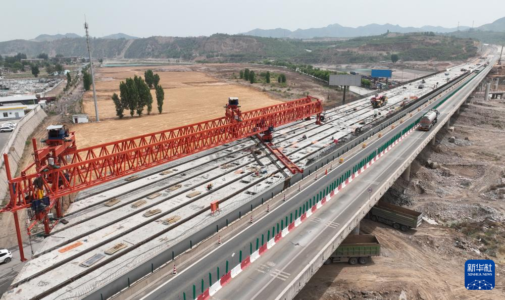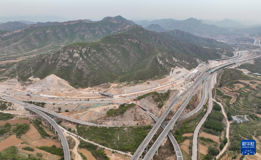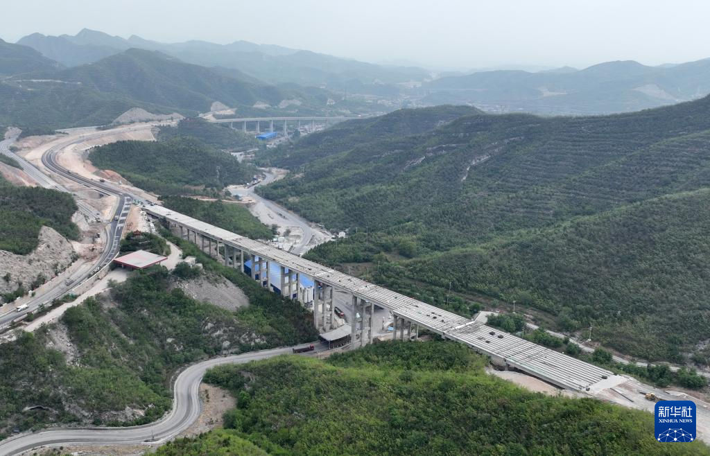 这是5月7日拍摄的石太高速改扩建项目石太高速与太行山高速互通施工现场(无人机照片)。