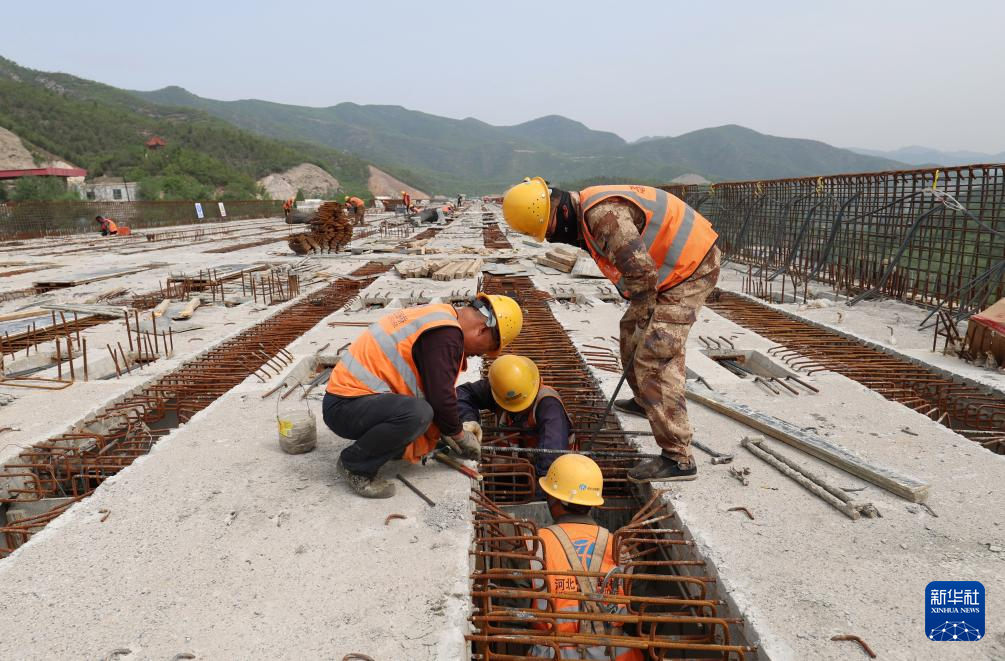 5月7日,工人在石太高速公路改扩建项目核桃园4号桥建设工地施工。