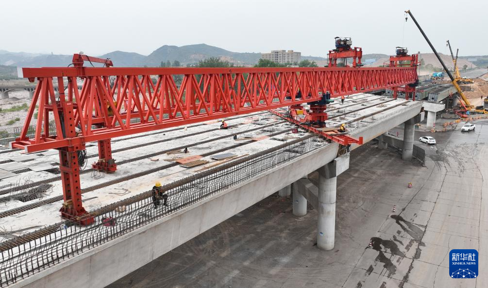 5月7日,工人在石太高速公路改扩建项目核桃园4号桥建设工地施工(无人机照片)。