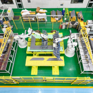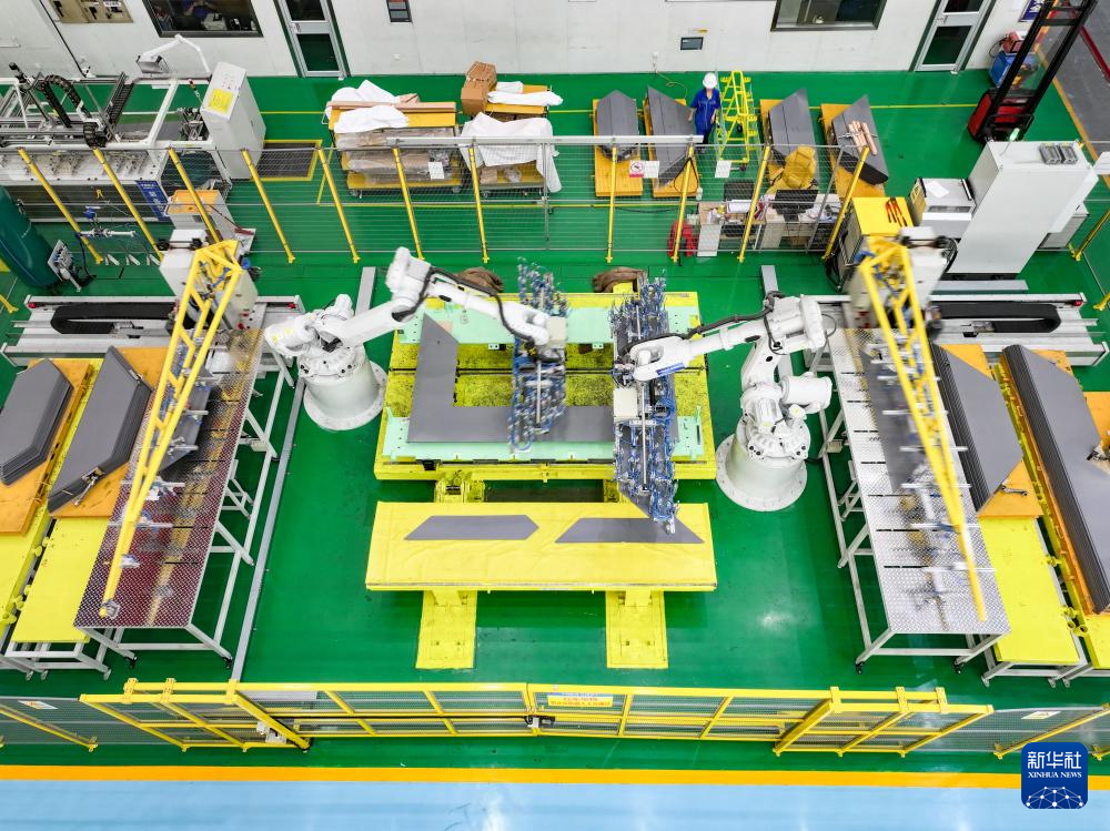 5月8日,在湖南省衡阳市雁峰区一家输变电企业,机械臂在装配车间作业(无人机照片)。