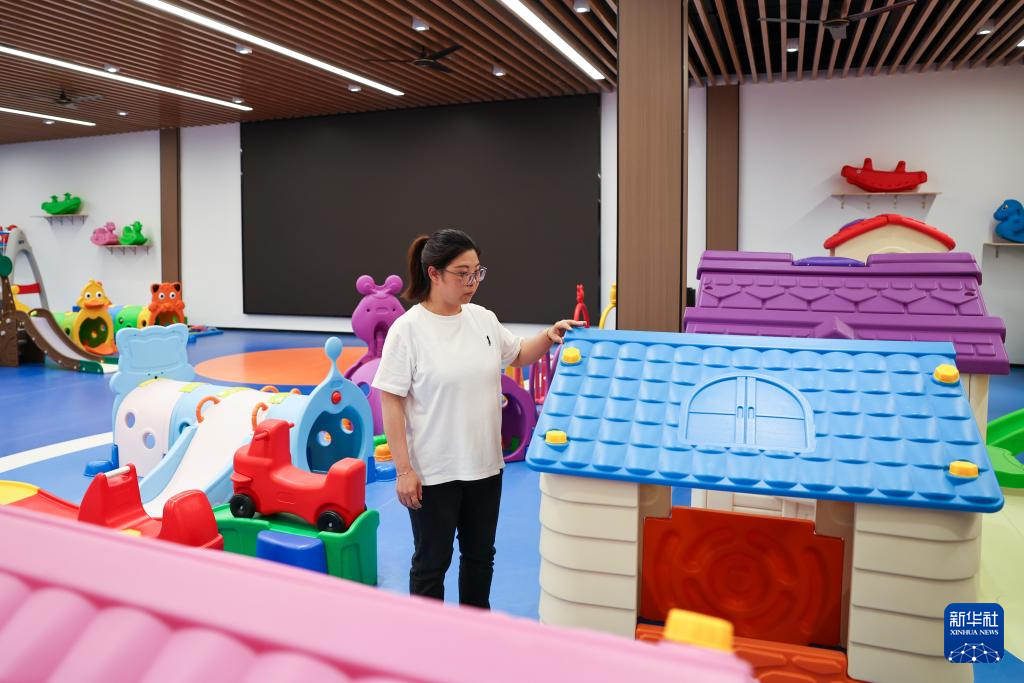 5月8日,浙江中凯游乐设备有限公司员工在样品室内组装一款新生产的教玩具产品。