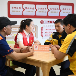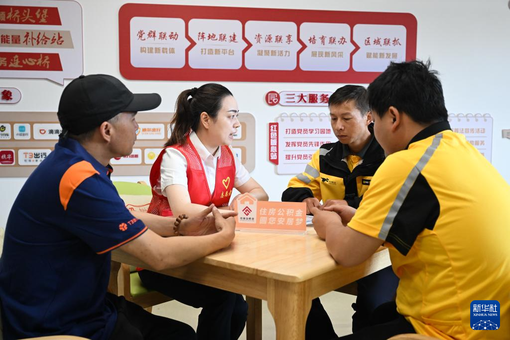 5月9日,在常州市天宁区红梅街道红动力新能源汽车服务舱,常州市住房公积金管理中心工作人员为外卖员、网约车司机提供开户咨询。