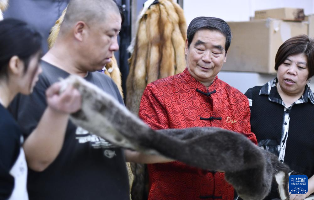 国家级非物质文化遗产盛锡福皮帽制作技艺代表性传承人、全国“五一”劳动奖章获得者李金善(右二)在车间内给年轻技师讲授选皮配料的技艺(4月22日摄)。