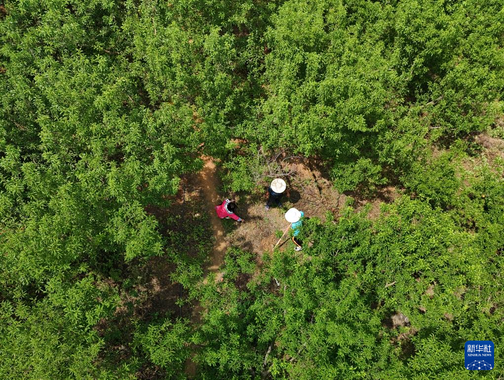 5月8日,卢丹在致富村的果园内和村民一起清除杂草(无人机照片)。