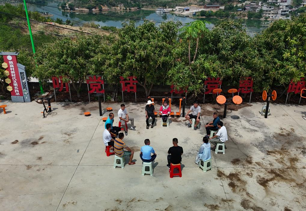 5月8日,卢丹在致富村向村民宣讲两会精神(无人机照片)。