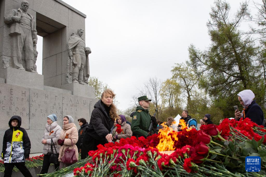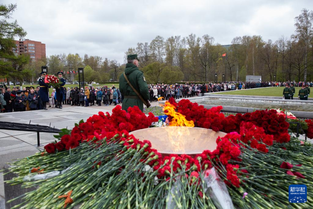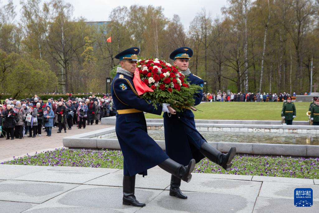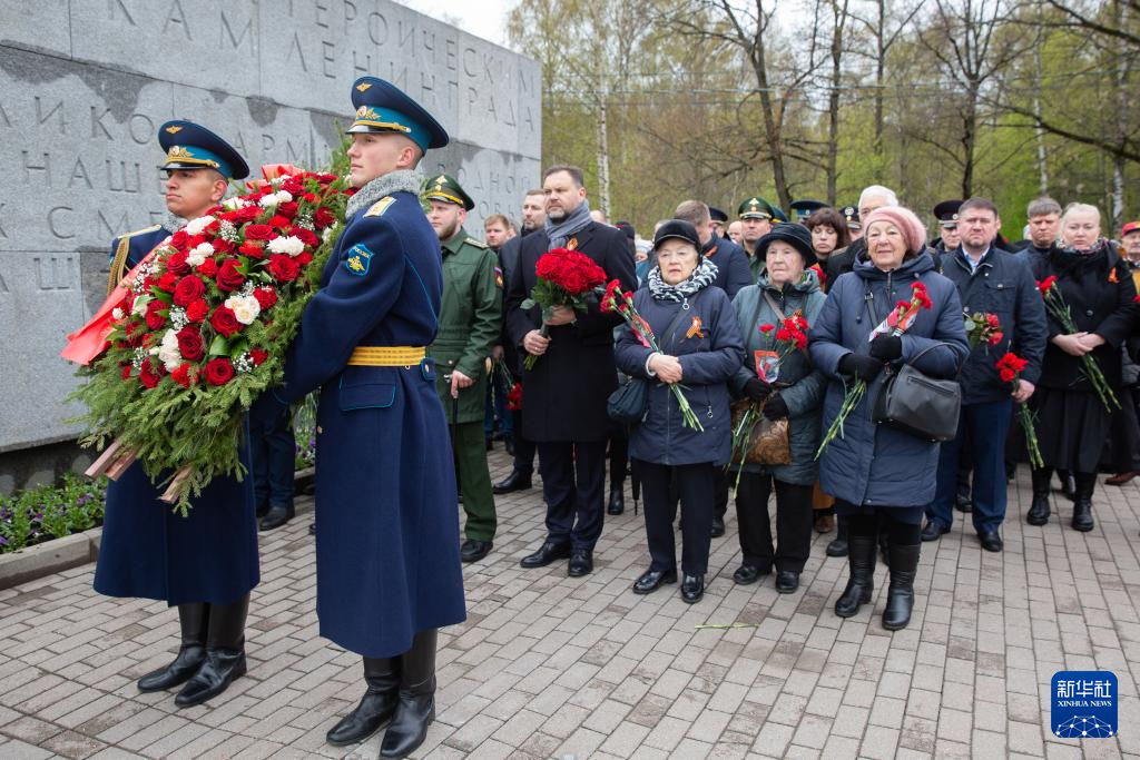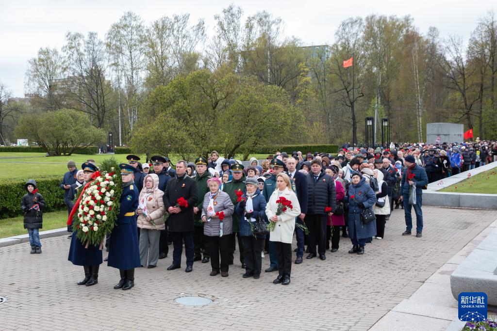 这是5月8日在俄罗斯圣彼得堡谢拉菲莫夫公墓拍摄的献花仪式现场。