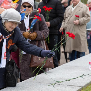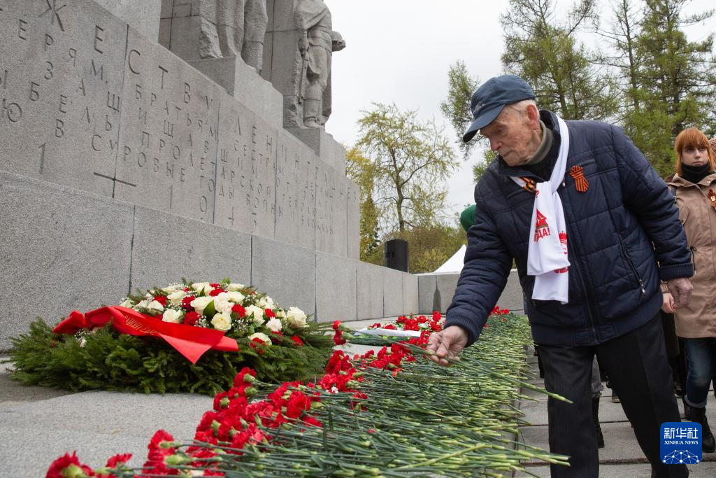 5月8日,在俄罗斯圣彼得堡谢拉菲莫夫公墓,一位老人在列宁格勒保卫战遇难者纪念碑前献花。