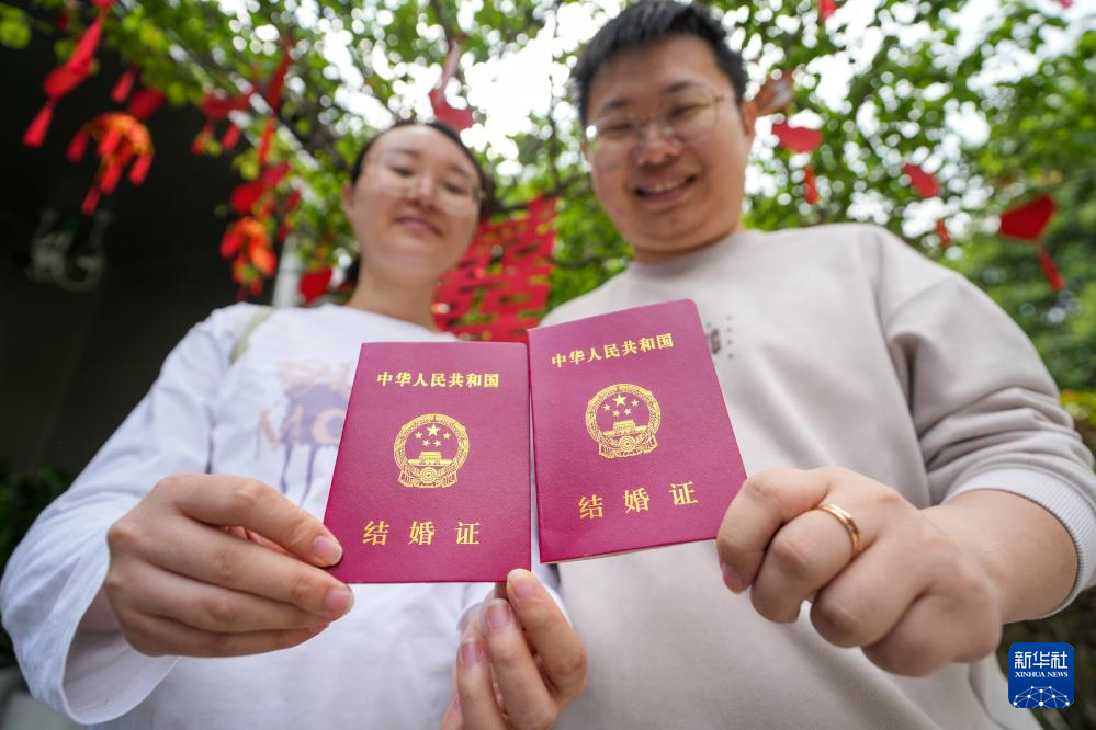 5月10日,一对新人在位于南京市玄武湖公园内的玄武区婚姻登记处登记结婚后展示结婚证。
