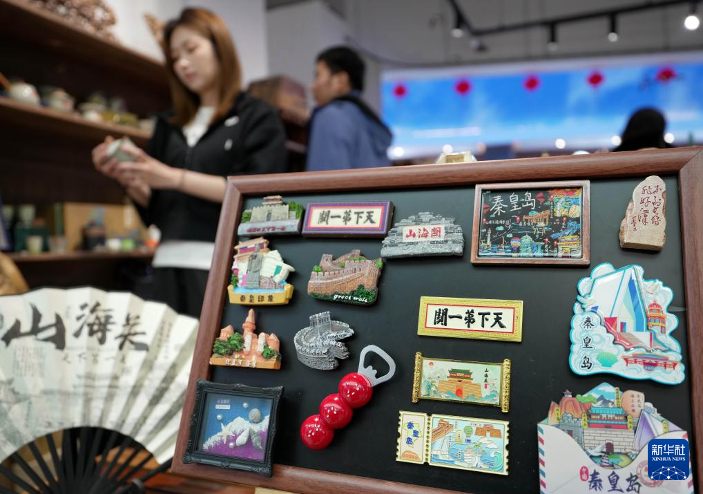 5月9日,司乘人员在京哈高速河北段山海关服务区休整大厅的商业区选购文创产品。