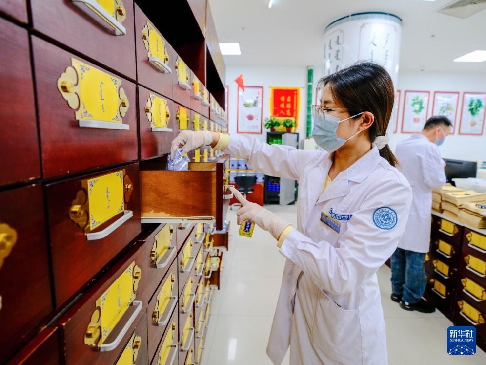 5月12日,在位于内蒙古自治区呼和浩特市的内蒙古自治区国际蒙医医院,蒙医药房的蒙药师宝特力格尔在为患者调剂处方。